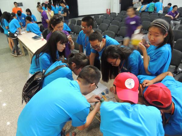 志愿者们为在场的营员们简单介绍了巡线机器人概念、电路的基本知识以及车体的设计与组装。随后,200余名营员被分为十个小队,领取了制作巡线机器人的基本元件,并被要求在队长的带领下在未来的几天中完成巡线机器人的制作。