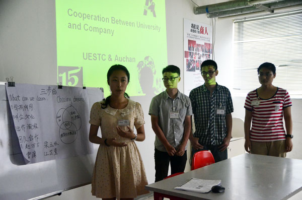 按照企业要求,同学们在完成体质测试后,进行了一个简单的开幕热身活动。12名同学在欧尚成都金牛店人力资源部负责人白云的指导下,随机分成3个小组,并以组为单位为自己的团队取名称、阐述团队的梦想以及希望在实习过程中学到的东西。各小组在展示环节将理论知识与实际结合,从各个方面阐述了团队的目标和理想,获得欧尚集团和学院领导的肯定。