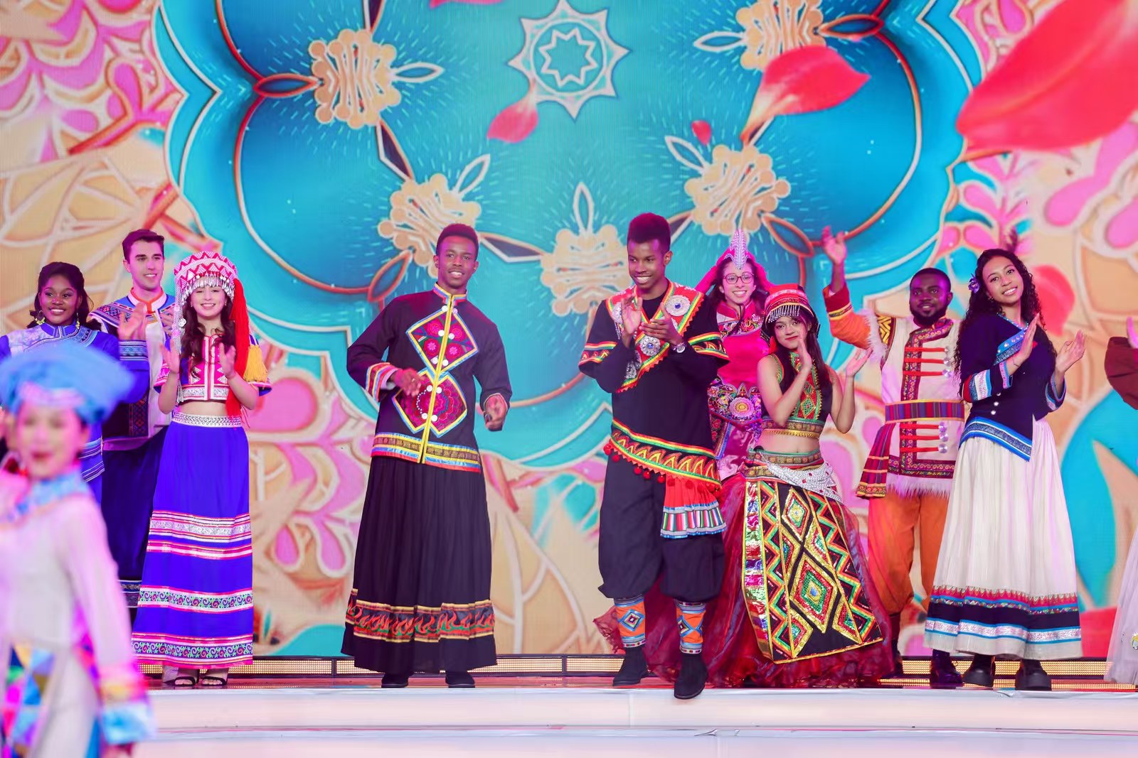 随后,二人身着云南民族服饰再度登场,与各国青年共同演绎群舞《最炫民族风》,以欢快的节奏和多元的舞姿将现场氛围推向高潮。