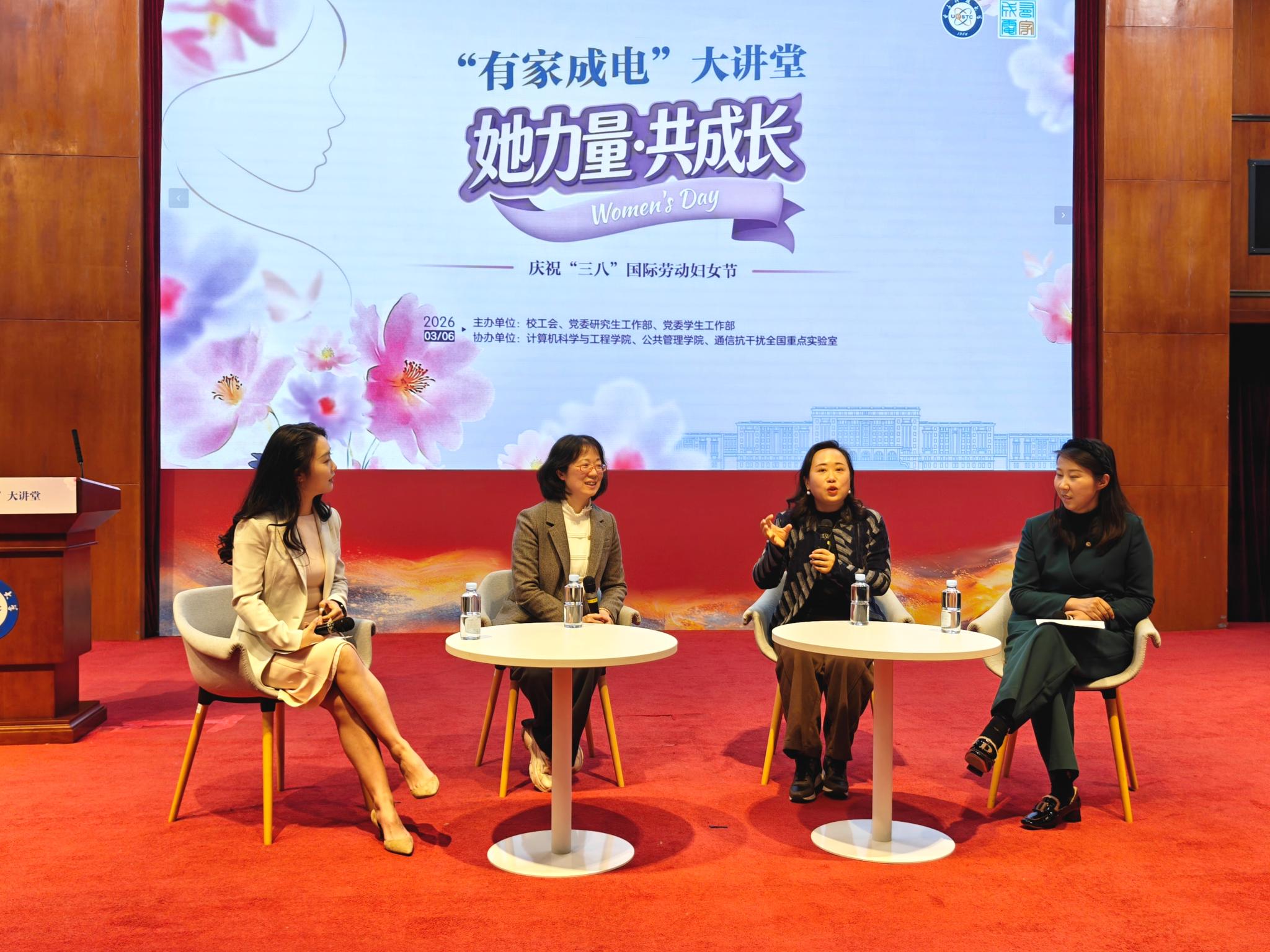 3月6日,在“三八”国际劳动妇女节来临之际,由校工会、党委研工部、党委学工部主办,计算机科学与工程(网络空间安全)学院、公共管理学院、通信抗干扰全国重点实验室协办的“有家成电”大讲堂之2026年“三八”国际劳动妇女节主题讲座在经管学院学术报告厅举行。计算机学院田玲教授、通信抗干扰全国重点实验室雷霞教授、公共管理学院董子铭教授作了主题分享。校工会、研究生院、党委研究生工作部、党委学生工作部相关负责人以及各学院的近300名师生参加活动。