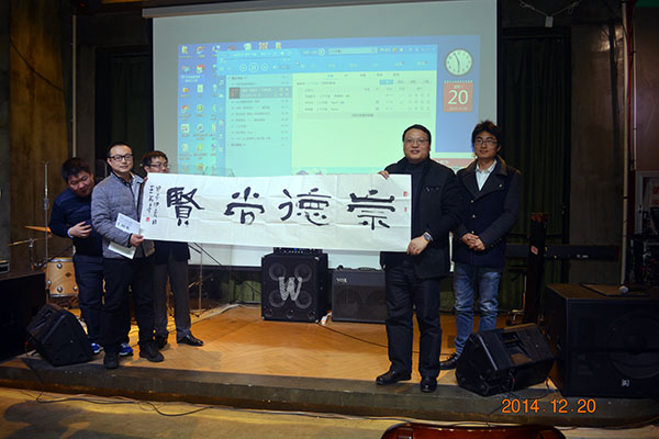 歌曲《美丽的心情》、《hello girl》、舞蹈《三寸天堂》等精彩的节目表演,使得新年联欢会高潮迭起。晚会结束前,MBA学员王淼向经管学院赠送了由其父亲王雨来(中国当代书画名家,中国美术协会会员,山西省美术家协会副主席)提笔的字画“崇德尚贤”,表达了对学院精心培养的感谢以及对本次活动的支持。