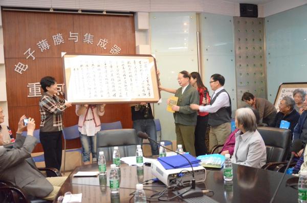校友们还分别向母校和微固学院捐赠了59级校友吴守箴的书法作品及其子吴斌的著作,罗佳慧代表学校接收了捐赠。