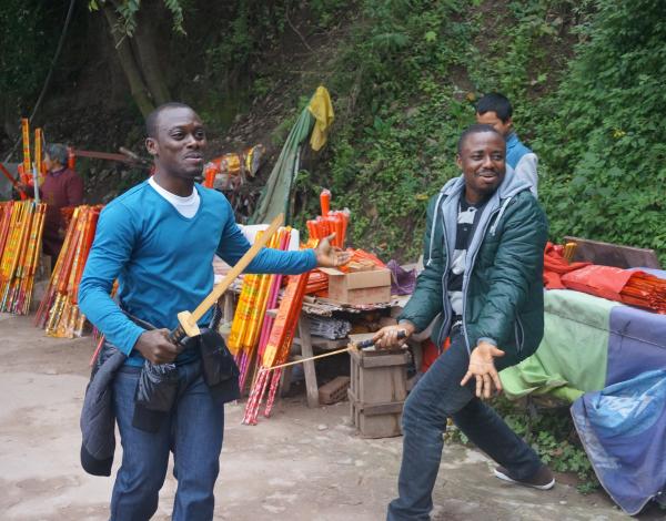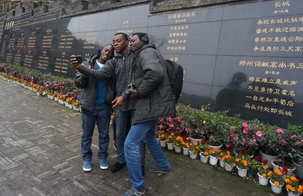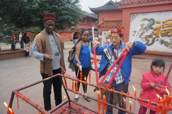 在金龙长城,留学生们一边聆听中国学生关于长城历史传说的讲解,一边争当“好汉”勇攀长城。在顶峰的金龙寺,游客们纷纷找留学生“好汉”们合影留念。几名留学生还与游客一起点香许愿,祈福在中国学业有成。