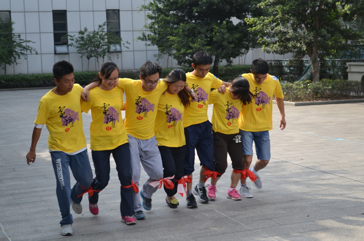 在齐头并进比赛中,每个学院派出7名代表,4男3女,其中男女老师各1名。7名队员一字排开,用布带将临近的队员小腿绑在一起进行跑步比赛,用时最少的队伍获胜。电子科学技术研究院参赛队伍以9秒34的成绩夺得第一名。