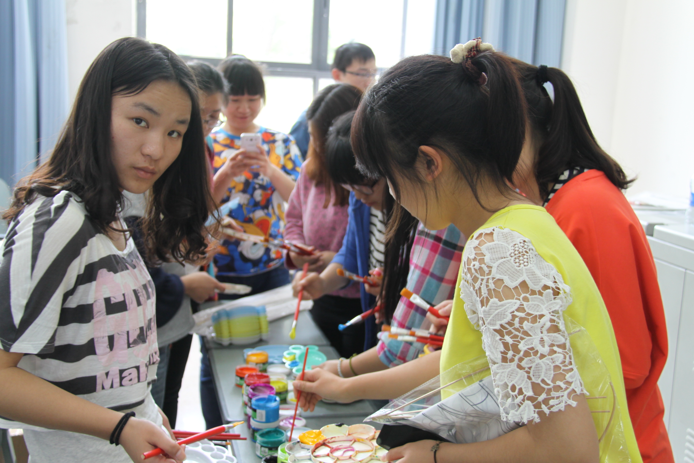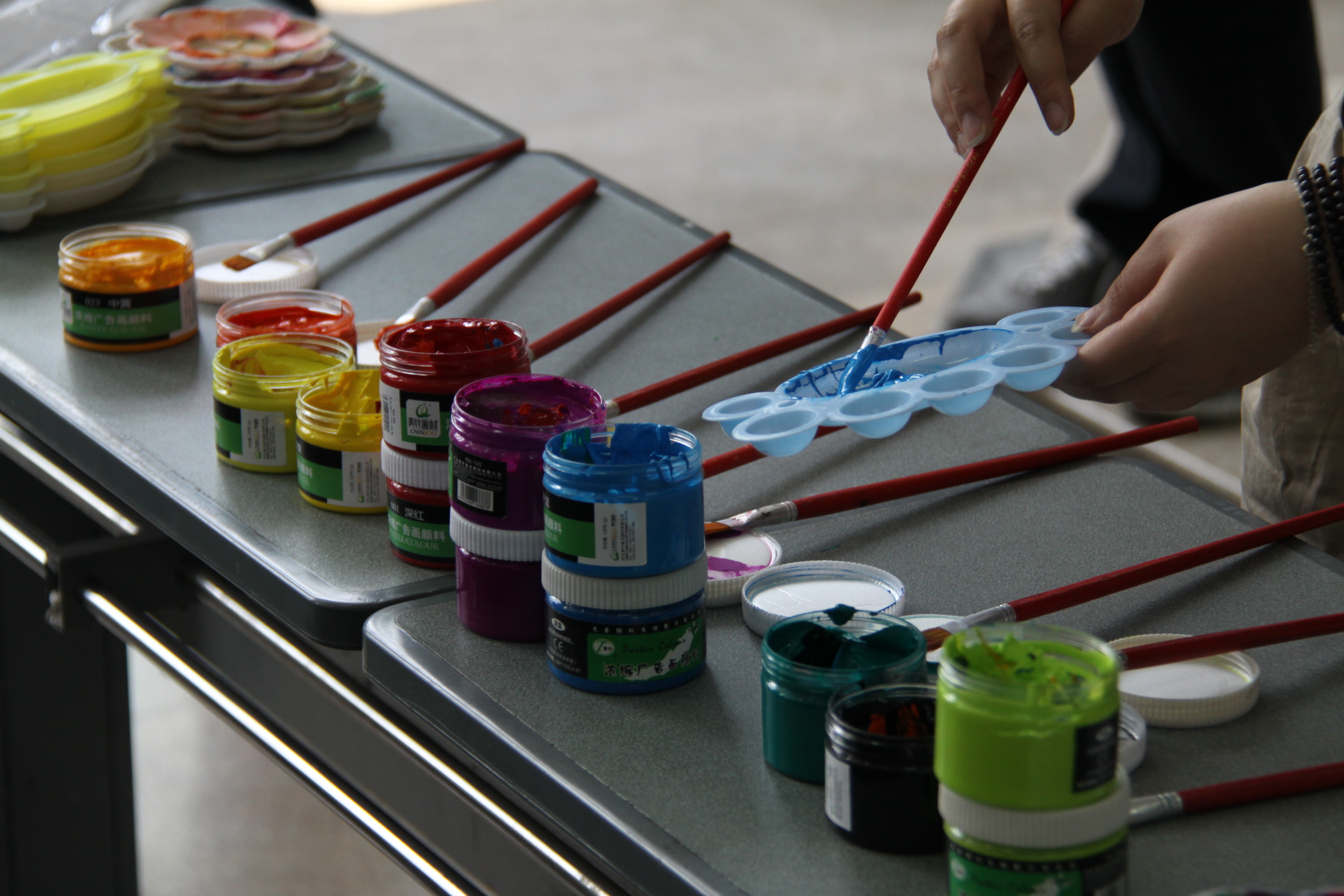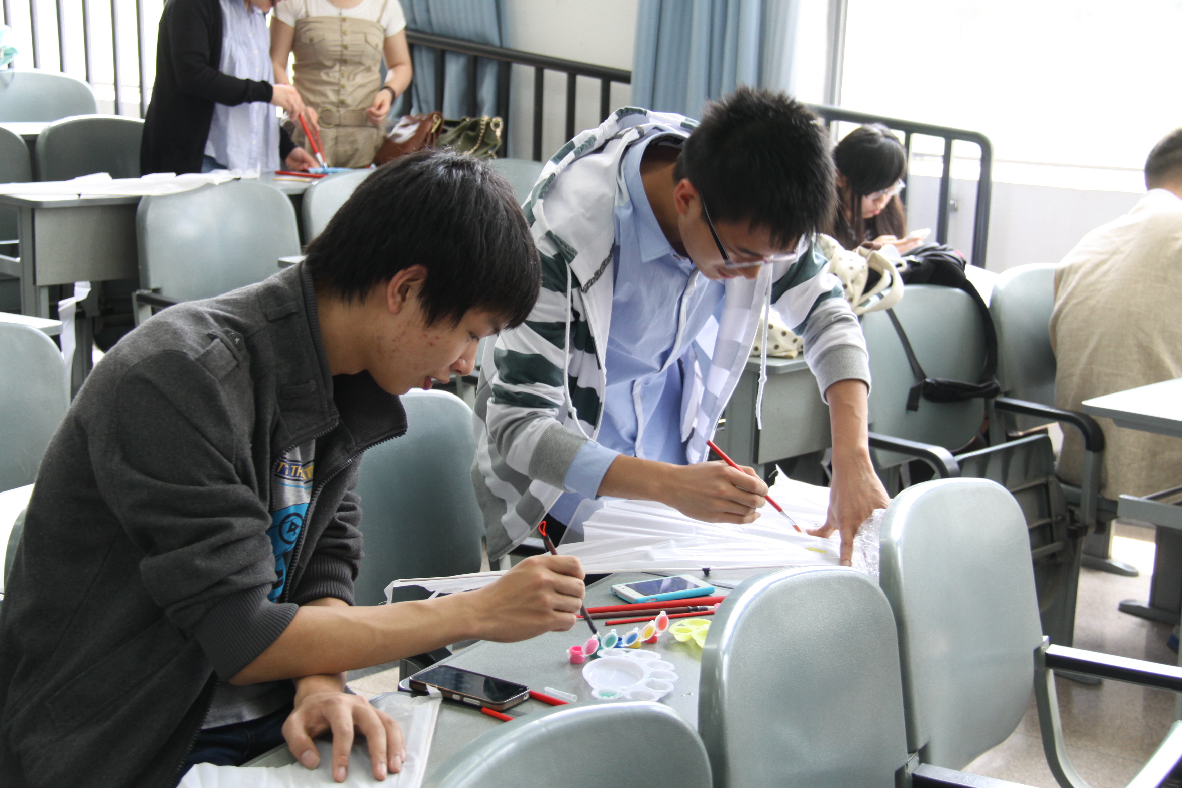 工作人员在教室里向参赛者发放制作风筝所需的纸剪刀与颜料等用品,同学们分工合作,剪纸、制作框架、调色、绘画,完成得井井有条。大约两个小时之后,漂亮的风筝制作完成,憨憨的熊猫、帅气的超人、可爱的海绵宝宝等,每一个都是同学们爱心和努力的结晶。