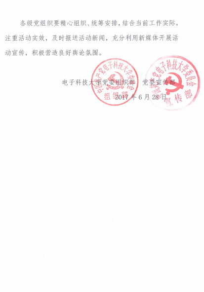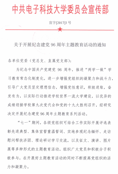 为纪念中国共产党建党96周年,推进“两学一做”学习教育常态化制度化,进一步增强党组织的凝聚力和战斗力,引导广大党员坚定理想信念,增强党性意识,积极进取,奋发有为,以实际行动推进学校世界一流大学建设,以优异的成绩迎接学校第九次党代会和党的十九大胜利召开,经研究决定开展纪念建党96周年主题教育系列活动。