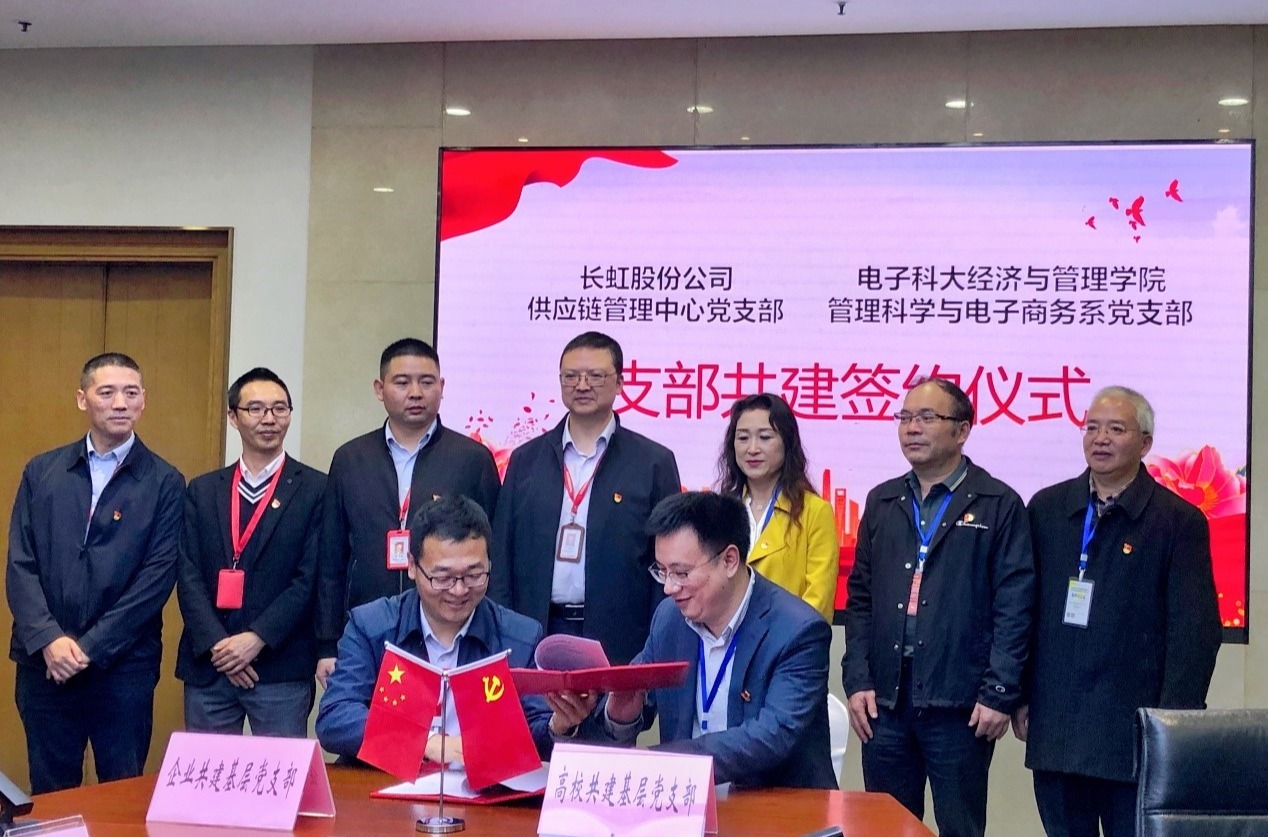 参观结束后,何树军介绍了长虹供应链发展情况及智慧供应链平台建设情况,晏鹏宇介绍了经管学院管理科学与电子商务系的发展情况。双方签署了党建共建协议,李钰和王光全共同为两个支部的党建共建揭牌。随后,李登峰同志主持了供应链管理研讨交流环节。双方就当前制造业供应链发展趋势、传统制造业如何利用数智技术赋能供应链、全球供应链风险等热点问题展开深入交流,李钰和王光全对本次支部共建活动作了总结。双方表示,此次活动只是序章,希望未来在校企党建、人才培养、产学研融合等领域能有更加深入、广泛、富有成效的合作。