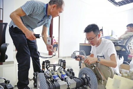 41岁的成都人彭倍2008年获得美国西北大学博士学位后回国,现在是四川阿泰因机器人智能装备有限公司的首席科学家、董事长。自2014年在华阳创办公司以来,他与团队成员们经常夜以继日地工作,根据客户需求研发解放劳动力的智能机器人,得到了客户们的肯定。为了能全身心地开发机器人,他把时间都投入在工作上,以至于每天仅睡5个小时。