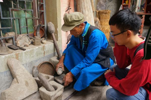 我们特意走访了村里的收藏家——年逾七十的手工艺人孟大爷,他收藏了许多上千年的古物。一进门,院落中摆放的各类农耕工具、手工艺品、民族服饰令人眼花缭乱。