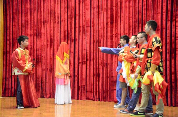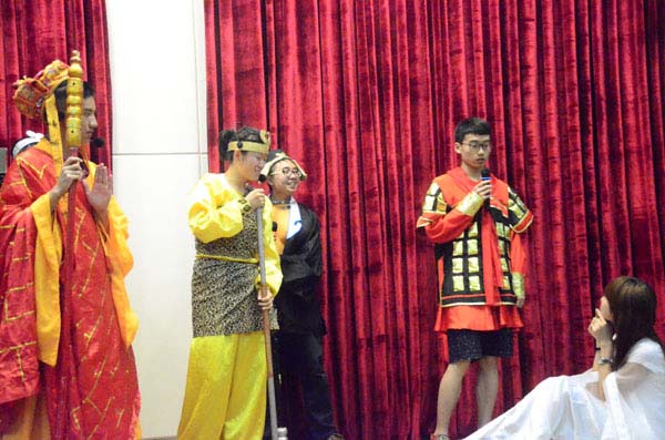 当天的汇报演出由外语学院邢青老师和外教Fred主持,分导师组进行,演出“笑”果十足。第一导师组表演的“三笑三国”率先出场,调动起全场气氛。第二导师组的西游记剧情紧凑精彩。另有各种反串角色使现场笑声不断,掌声连连。第九导师组的话剧宝莲灯为本次演出画上圆满句号。