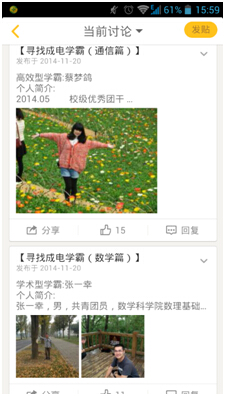 全校19个学院各个班级纷纷召开主题班会,让同学们主动发现身边那些平凡同学在学习目标、兴趣、习惯、效率、成效等方面的可贵品质以及感人事迹。同学们讨论学霸品质、分享学霸经历、讲述学霸故事,并推选出班级学霸。各学院通过网络平台展示学霸风采、宣传学霸事迹,广泛形成了 “赞学霸”的良好局面,发挥了学霸的榜样引领作用。在此基础上,全校共推选出50名“学霸”候选人。