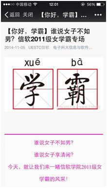 党委学工部专门开展“寻找成电学霸”网上主题活动,通过成电微盟、面聊系统为“学霸”候选人点赞和投票,发动同学们选出自己心目中的“成电学霸”。据统计,仅在面聊系统就有上千名同学参与投票。