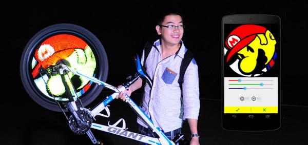 在参加“黑马大赛”时,它还只能显示“小黄人”“马里奥”“苹果”等“卡通图案”,但经过3个月的改进,如今的“炫轮”已经能够显示更加高清的图片了。通过手机App实现图像实时更换的功能也更加强大,可用手机蓝牙即拍即传,且具备动画效果,给人无比酷炫的感觉。